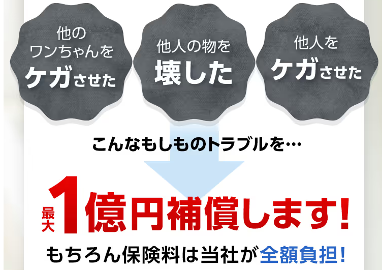 「愛犬が他の犬をケガさせてしまった」「他人の物を壊してしまった」といった万が一のトラブルに対し、最大1億円まで補償される賠償責任保険に自動で加入できます。保険料は販売会社が全額負担してくれます。