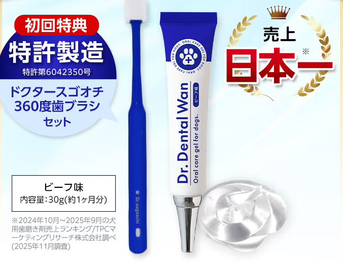 ドクターデンタルワンは、累計130万本以上売れている犬のためのデンタルケア用品です。犬の口臭や歯垢・歯石のケアを目的に作られたジェル状の歯磨き剤で、歯ブラシが苦手なワンちゃんにもおすすめです。使い方はとても簡単で、食後などに適量を直接舐めさせるか、歯や歯茎に塗布するだけです。歯磨きが苦手な犬でも比較的取り入れやすいケア方法です。また、犬にとって危険なキシリトール等は一切配合されていない点も安心ポイントとして挙げられます。