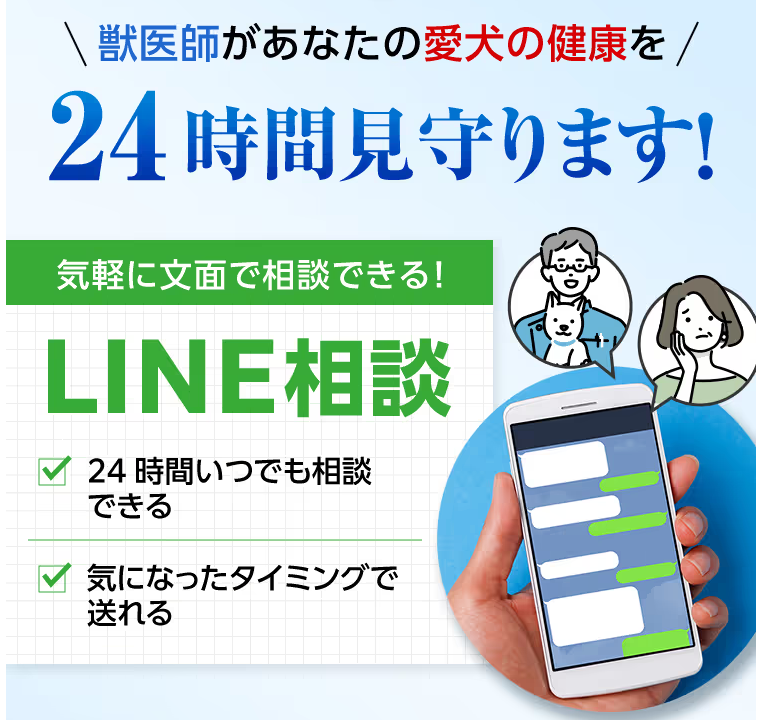 獣医師や動物看護師といった専門家に、LINEを通じて無料で相談できるサービスです。商品のことだけでなく、愛犬の体調や栄養面など、日頃の心配事を何度でも質問できます。