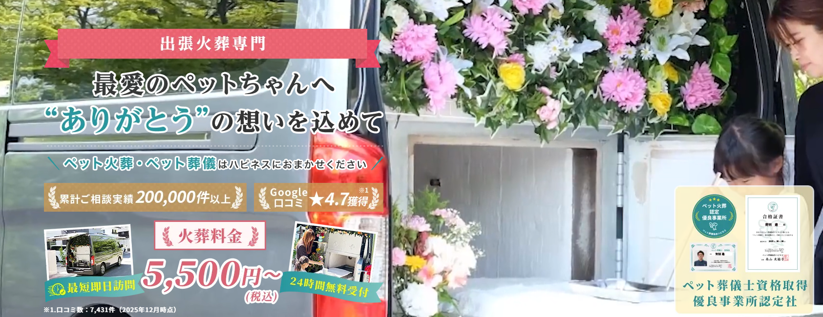 ペット火葬ハピネスは、低価格な合同火葬からセレモニーまで幅広いプランを提供し、専門スタッフが飼い主の気持ちに寄り添うサービスを目指しています。出張火葬や供養方法の選択肢が多く、ペットとの最後のお別れを大切にしたい方に選ばれている葬儀業者です。