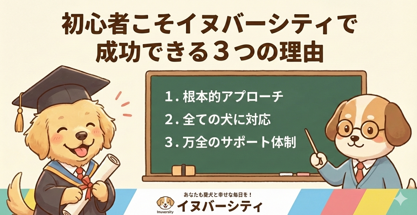 多くの飼い主さんに支持されているイヌバーシティですが、最後になぜこの教材が、数ある情報の中から選ばれ、多くの家庭で確かな成果に繋がっているのか。そして、初心者の方こそイヌバーシティで成功できる3つの理由を解説します。