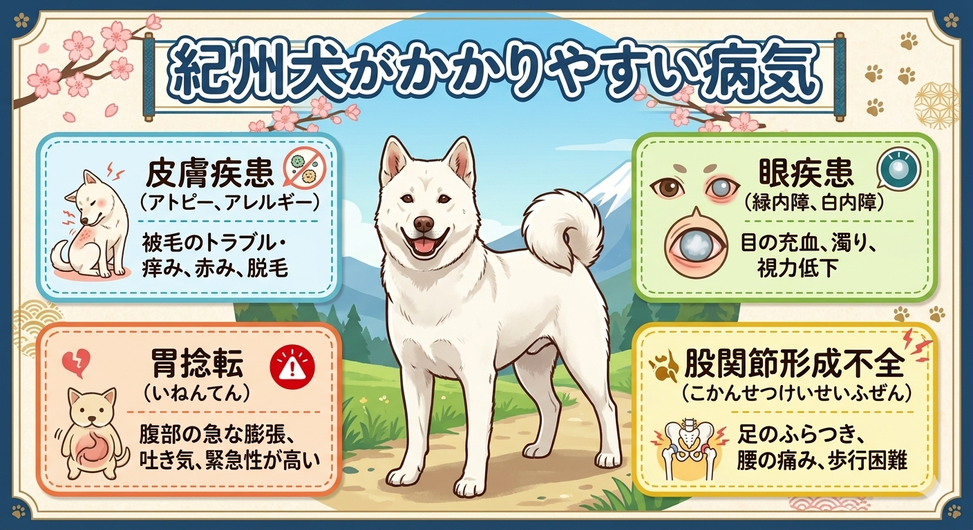 紀州犬は活動的で健康的な犬種ですが、それでもいくつかの病気にかかりやすい傾向があります。以下に、紀州犬がかかりやすい病気とその予防法について解説します。
