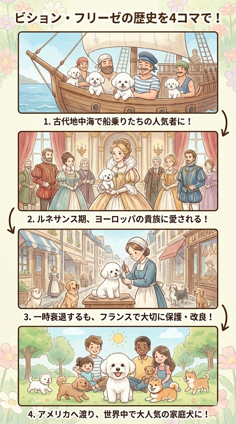 ビション・フリーゼは、地中海沿岸を起源にもつ古い愛玩犬種です。祖先はバルビー系の水猟犬とされ、船乗りたちに連れられて各地へ広まりました。中世にはスペインやイタリアを経てフランスに渡り、ルネサンス期のフランス宮廷では、その白くふわふわした被毛と明るい性格から王侯貴族に愛されました。