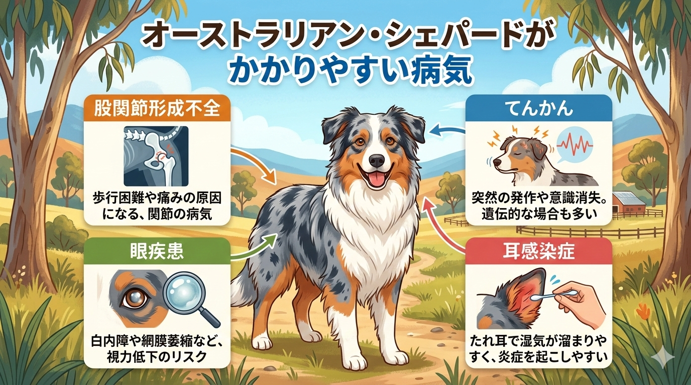 オーストラリアン・シェパードは、特定の病気にかかりやすい傾向もあります。以下に、オーストラリアン・シェパードがかかりやすい病気とその予防法について解説します。