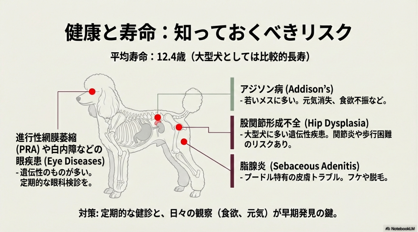 スタンダード・プードルは特定の遺伝的な病気にかかりやすい傾向もあります。以下に、スタンダード・プードルがかかりやすい病気とその予防法について解説します。