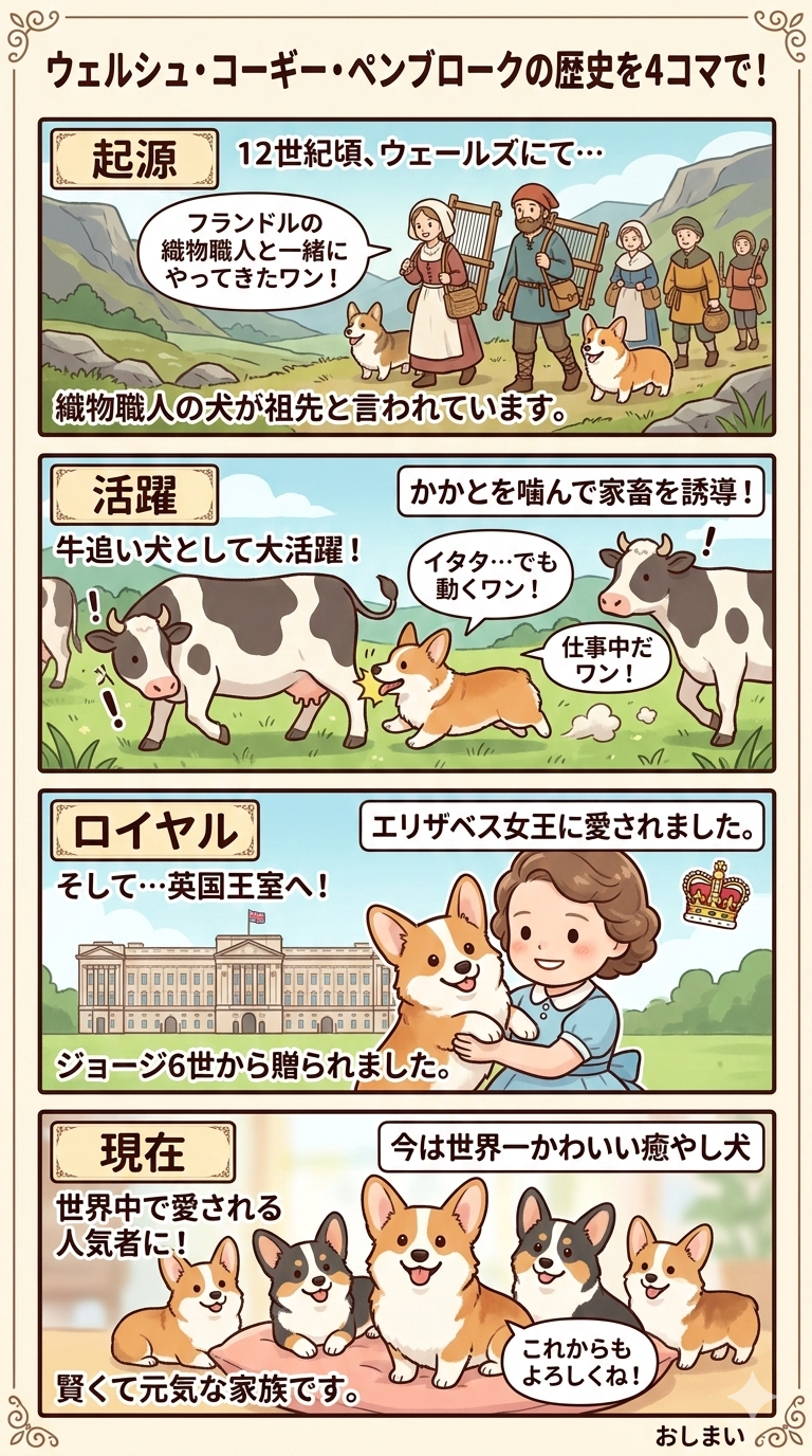 ウェルシュ・コーギー・ペンブロークは、イギリス・ウェールズのペンブロークシャー地方を原産とする牧牛犬です。起源は12世紀頃ともいわれ、フランドル地方から渡来した犬が祖先という説があります。牛のかかとを素早く噛んで群れを動かす“ヒーラー”として活躍しました。1934年にカーディガン種と分離登録され、独立犬種に。20世紀にはエリザベス2世に愛されたことで世界的な人気を確立しました。