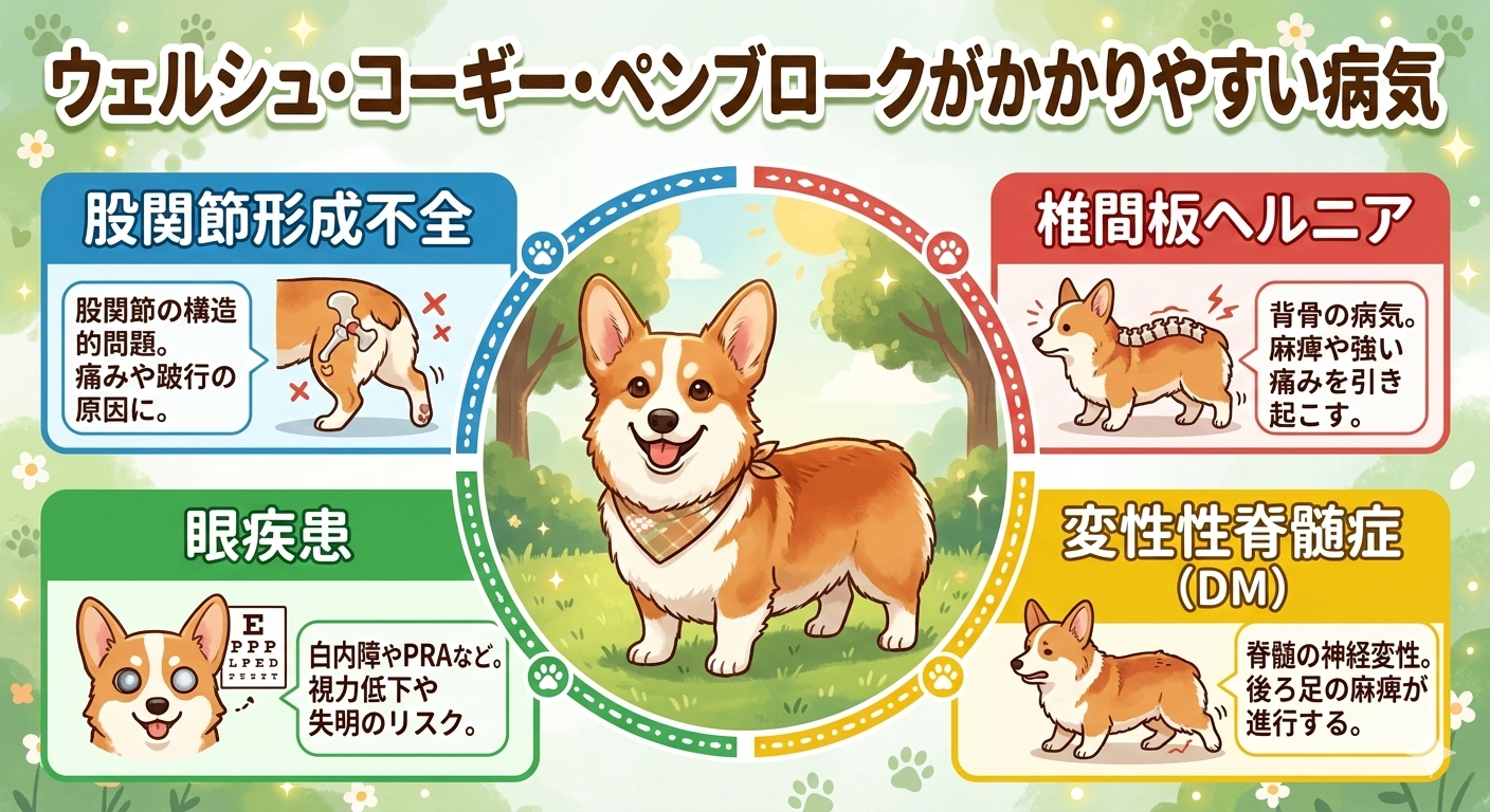 ウェルシュ・コーギー・ペンブロークは、いくつかの遺伝的な健康問題にかかりやすいことも知られています。以下に、ウェルシュ・コーギー・ペンブロークが特に注意すべき病気と、その予防法について解説します。