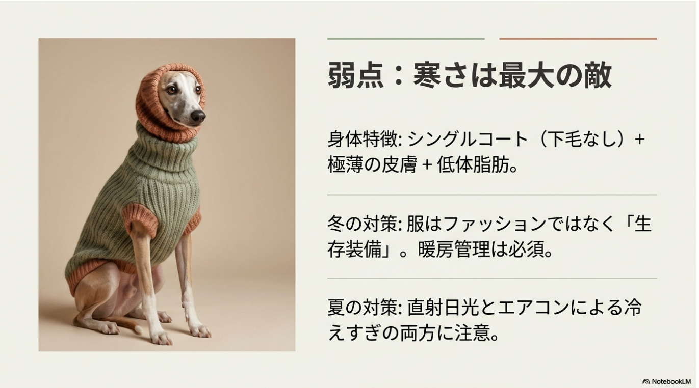 シングルコートで皮下脂肪が少ないため、寒さは物理的な痛みとして彼らを苦しめます。
