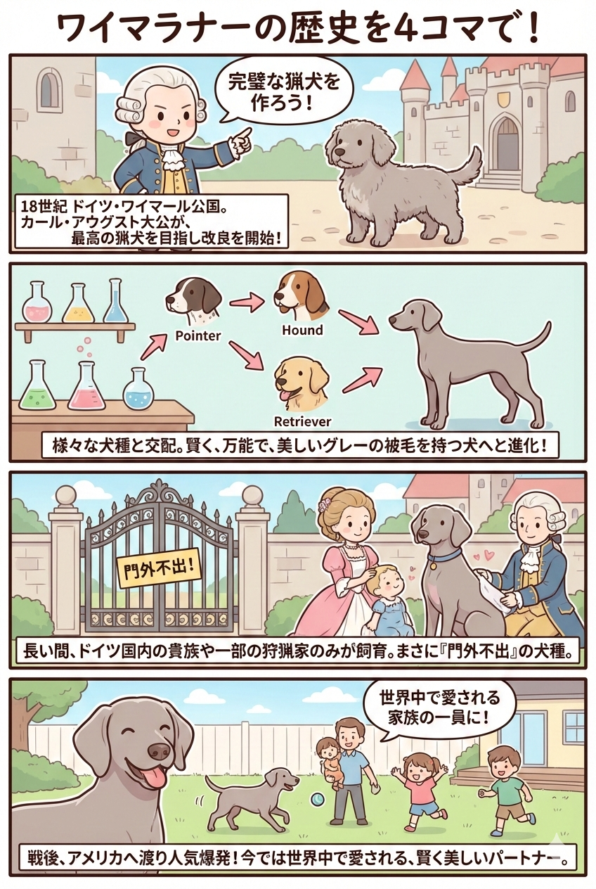 ワイマラナーは18世紀のドイツ・ワイマール地方で誕生したとされる狩猟犬です。ワイマール大公カール・アウグストの宮廷で、大型獣を追跡できる優秀な猟犬として育成されました。ブラッドハウンドやポインター系犬種などが交配に関与したと考えられています。当初は貴族のみが飼育を許された希少な存在でしたが、19世紀後半に一般へ広がり、20世紀にはアメリカでも人気を獲得。現在はその高い知性と俊敏性、美しいシルバーグレーの被毛で世界中に愛されています。