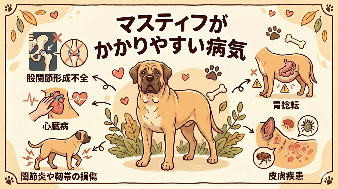 マスティフは、特定の健康リスクを抱えることがあります。以下に、マスティフがかかりやすい病気とその予防法について解説します。