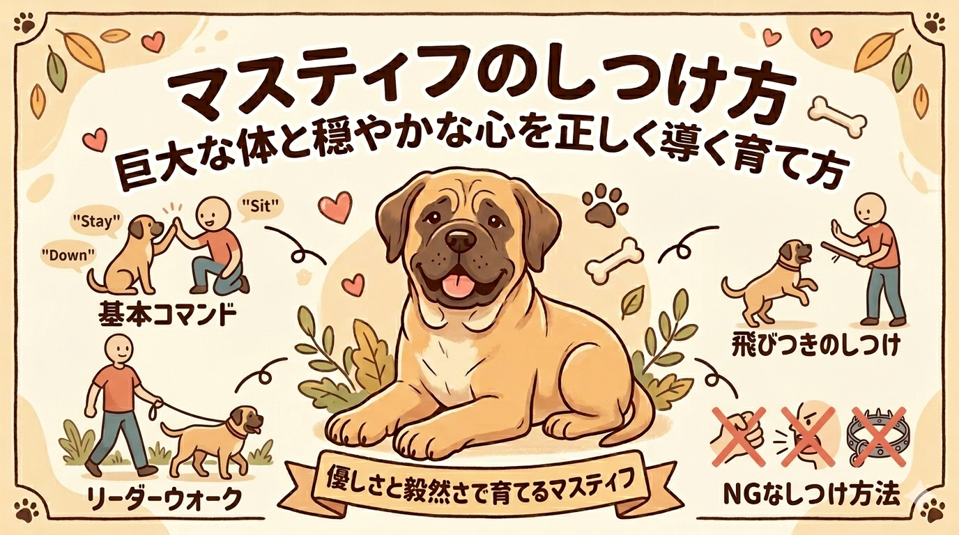 マスティフは、その圧倒的な体格と落ち着いた雰囲気から「怖そう」「飼うのが難しそう」と思われがちな犬種です。しかし実際には、とても穏やかで忠誠心が高く、家族思いな性格を持つ魅力的な犬でもあります。ただし、体が大きい分、しつけが不十分だと日常生活で大きなトラブルにつながる可能性もあります。そこで、マスティフの性格を理解した上で、初心者でも実践できるしつけの基本とよくある問題行動への対処法を解説します。