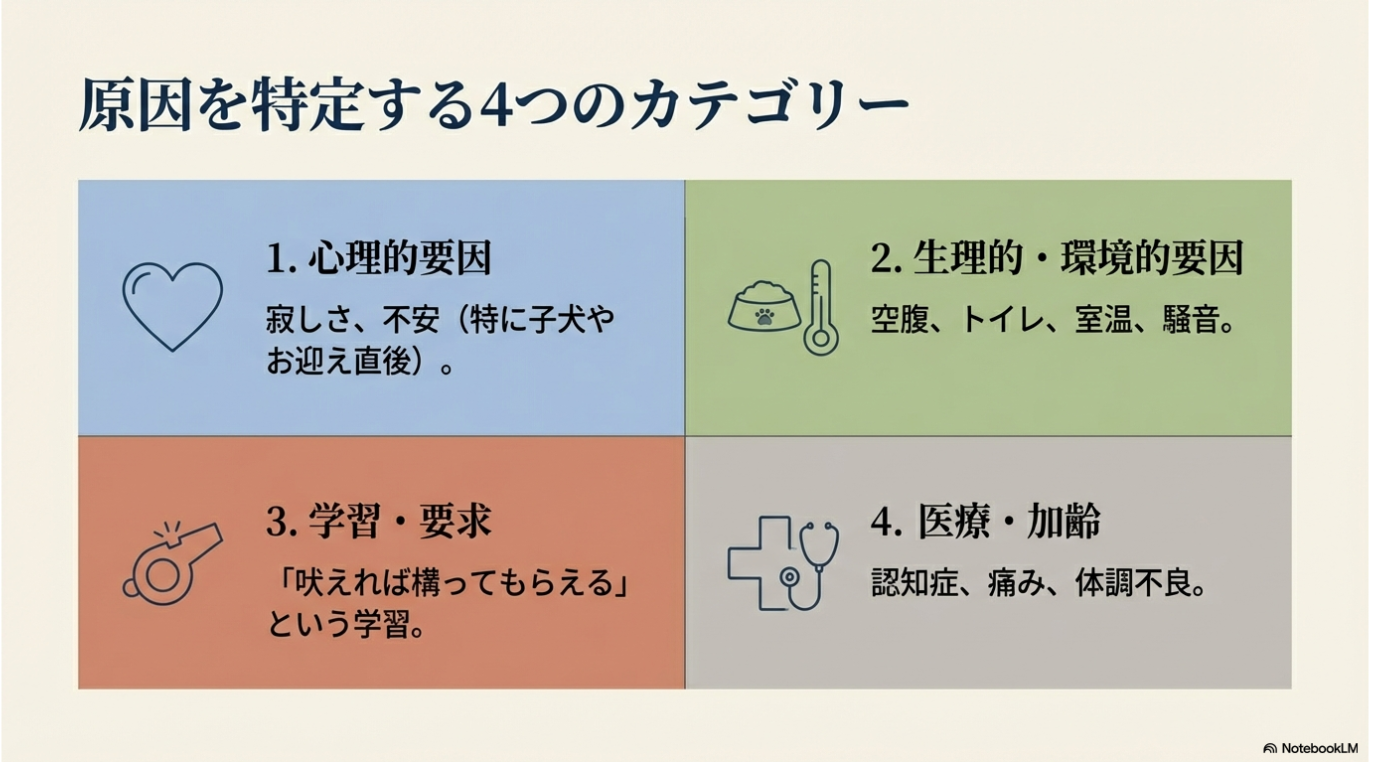 夜鳴きの原因を誤認して対処すると、かえって状態を悪化させるリスクがあります。例えば、身体的な痛みが原因で鳴いているのに「要求吠え」と決めつけて無視を続ければ、病状の悪化や深刻な不信感を招きます。以下の4つのカテゴリーから、愛犬の鳴き声の種類や状況を照らし合わせてみてください。
