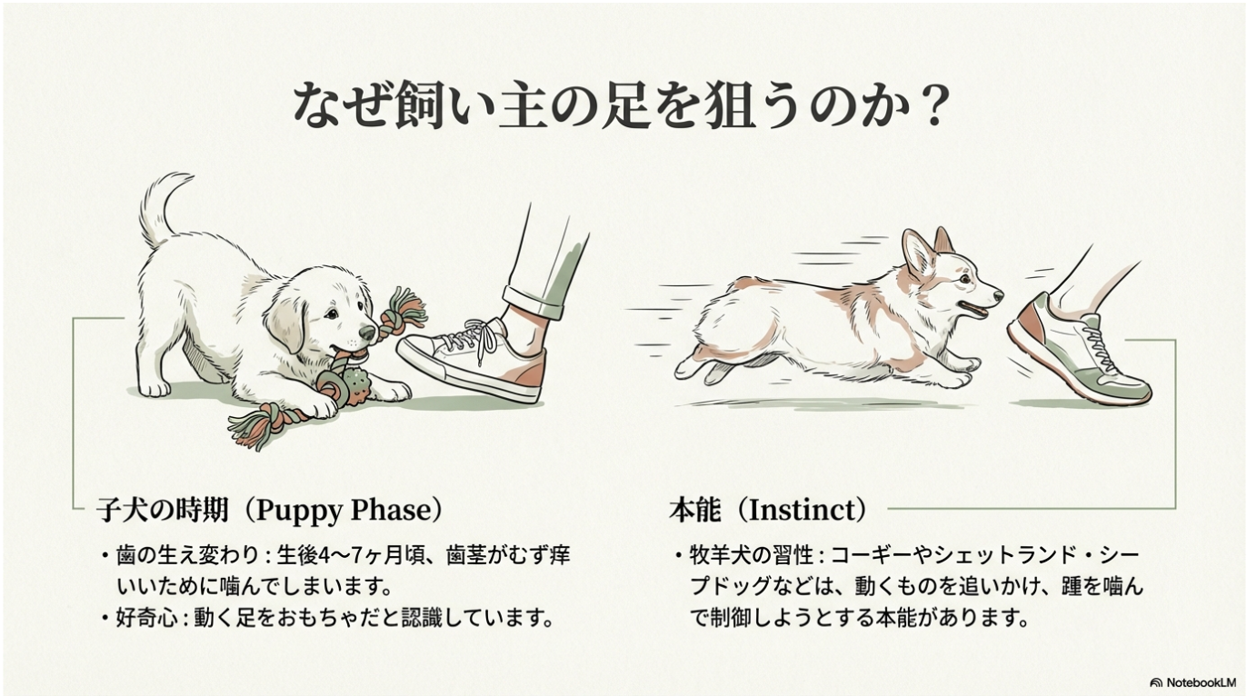 飼い主の足をターゲットにする行動は、多くの場合、犬の成長段階や種族特有の本能が色濃く反映されています。