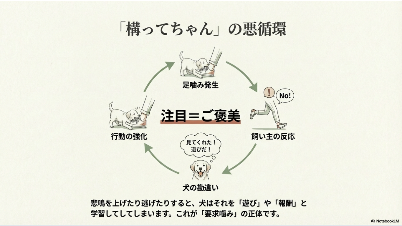 噛んだ際に飼い主が悲鳴(高い声)を上げたり、慌てて逃げたりすると、犬はそれを「楽しい反応」と捉え、遊びの誘いだと誤解します。このような経験を一度学習すると、犬は「噛めば構ってもらえる」と考え、繰り返し足を噛むようになります。